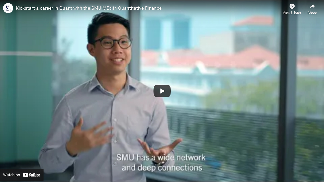 The SMU MSc in Quantitative Finance is designed to equip you with both an in-depth knowledge of quantitative finance and a business-oriented, entrepreneurial mindset. As such, the curriculum will bridge both theory and practice, helping you build expertise and skillsets that you can immediately apply to solving real-world problems.