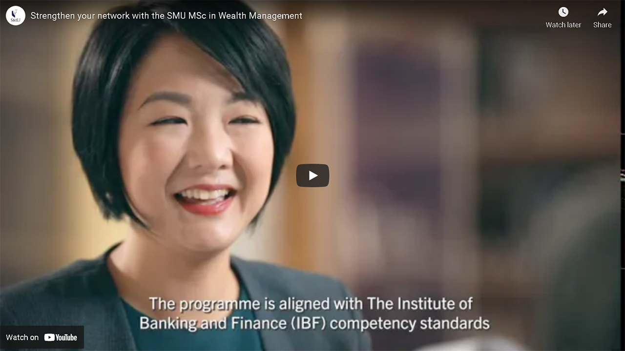 MWM offers a specialised curriculum in global wealth management with an Asian focus. It is the first MSc in Wealth Management programme in Asia and is completed within 12 months over five study blocks (2.5 weeks per study block). You will undergo a preparatory module designed to prepare you before the first study block, and the programme will culminate in the completion of an individual project on a research topic of your choosing. Upon successful completion of the programme, you will be awarded a Master’s degree by SMU and certificates by eminent universities in Switzerland and USA. The programme is delivered by experienced faculty made up of senior academics with industry experience and successful wealth professionals with academic exposure. Classroom learning is complemented by case studies, team activities, pre-course assignments, computer-aided learning, simulations, industry talks, site visits and field trips. The programme’s modular structure allows you to meet your professional and personal obligations while pursuing an academic degree. Scholarships are available based on merit for selected participants and you will have the opportunity upon application to intern in various financial institutes during a one-year period. This programme is recognised by the CFA Institute and CAIA as a collaborative partner.